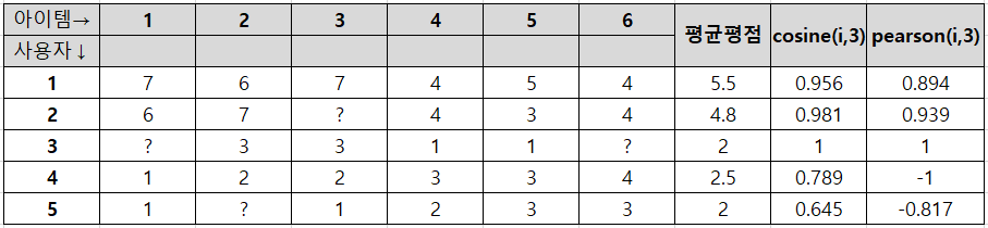 때문에 각 벡터의 내적만 구하는 cosine 유사도말고 평균을 빼주는 pearson 유사도를 사용한다.