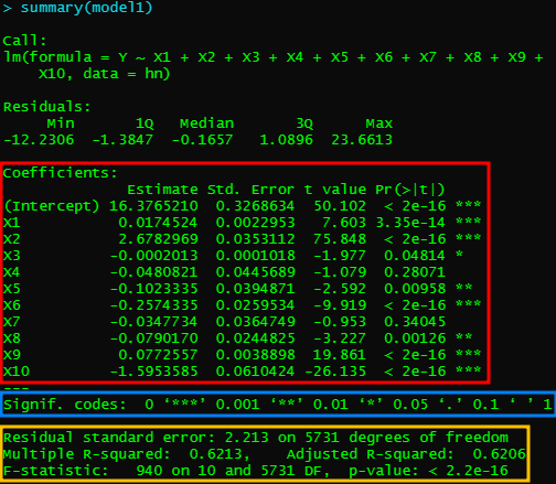 하나를 예를 들어 해석해보면, X1의 회귀계수는 β1 = 0.017이며, 표준편차는 0.002, t-value는 7.603이네요.