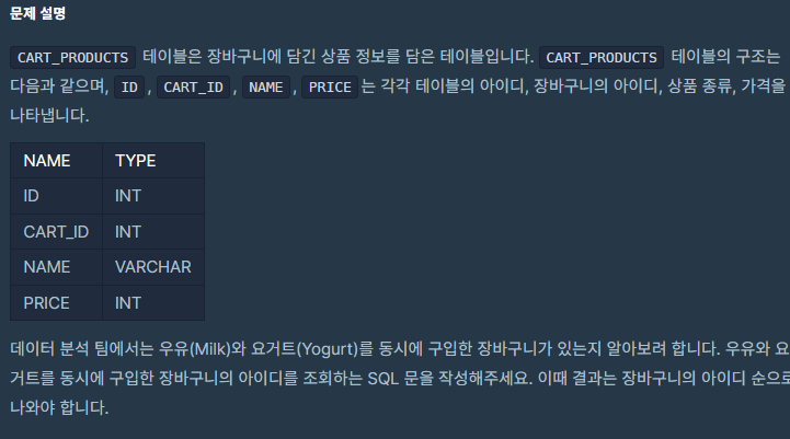 데이터 분석 팀에서는 우유(Milk)와 요거트(Yogurt)를 동시에 구입한 장바구니가 있는지 알아보려 합니다. 우유와 요거트를 동시에 구입한 장바구니의 아이디를 조회하는 SQL 문을 작성해주세요. 이때 결과는 장바구니의 아이디 순으로 나와야 합니다.